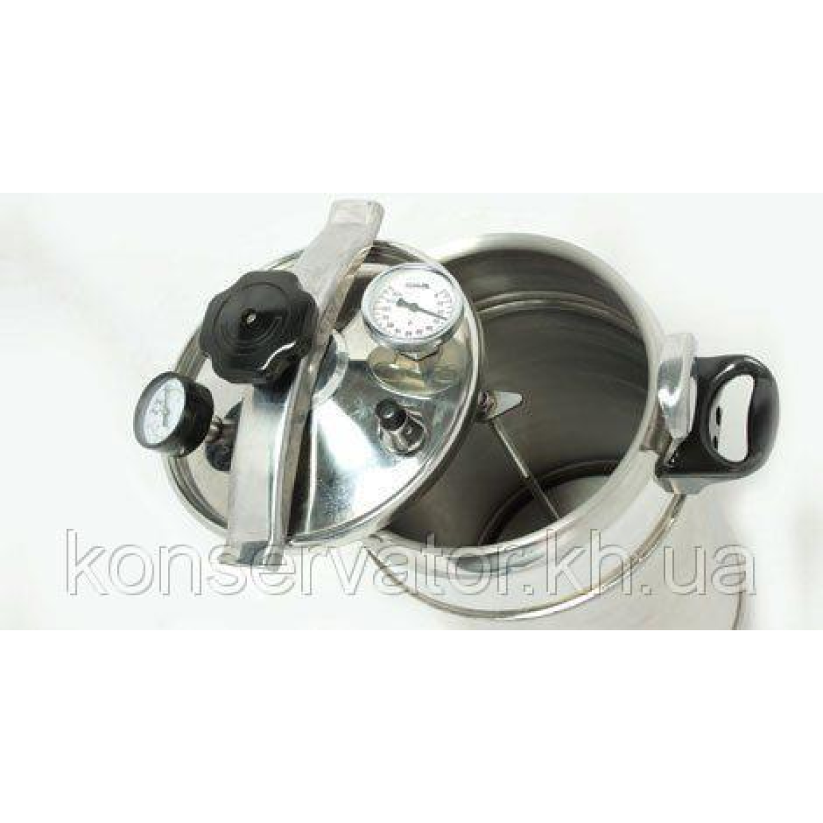 1. Повністю безпечний! Обладнаний автоматичним клапаном контролю надлишкового тиску. Він самостійно підтримуватиме в автоклаві необхідний тиск. Спеціальний неіржавкий сплав підвищеної міцності унеможливлює деформацію автоклава. За допомогою манометра та термометра ви завжди зможете переконатися в коректності роботи автоклава.
