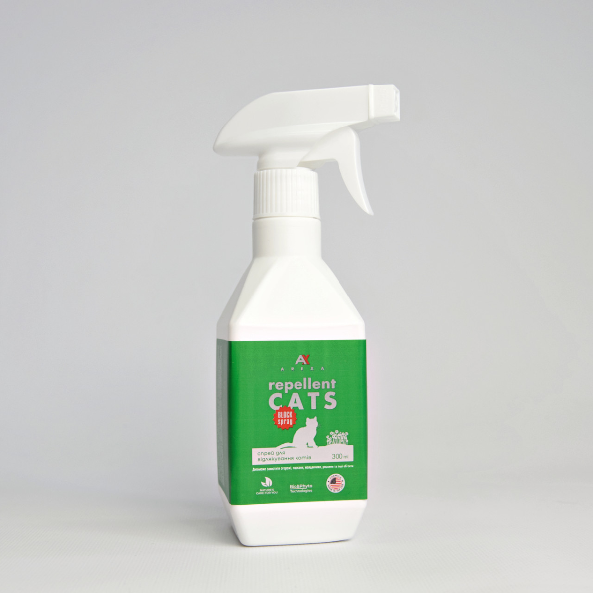 Засіб безпечний для тварин. Гуманна формула засобу має потужний вплив на котів і містить ефективну суміш інгредієнтів, що відлякують котів на біологічній основі. Спрей AREXA складається з рослинних екстрактів та олій, які при використанні за призначенням безпечні для сім’ї, домашніх тварин і навколишнього середовища в будь-яку пору року.