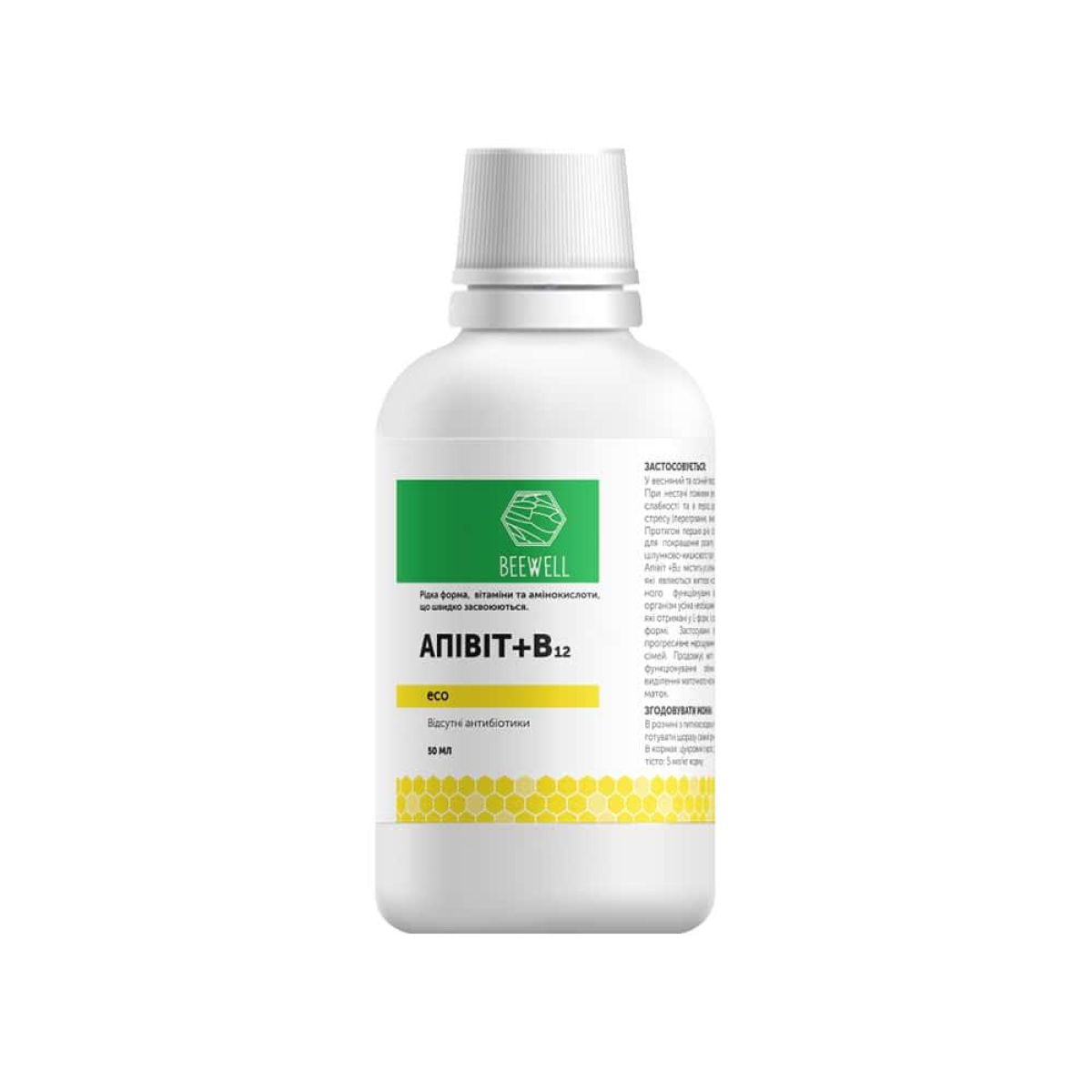 Апівіт + В12 містить усі вітаміни й амінокислоти, які є життєво необхідними для правильного функціонування організму. Забезпечує організм усіма необхідними амінокислотами, які отримані в L-формі, і вони є природними і вільною формою. Використання препарату забезпечує прогресивне нарощування живої маси бджолиних сімей. Продовжує життя бджіл і стабільне функціонування обмінних процесів. Збільшує виділення маткового молочка під час вигодовування маток.