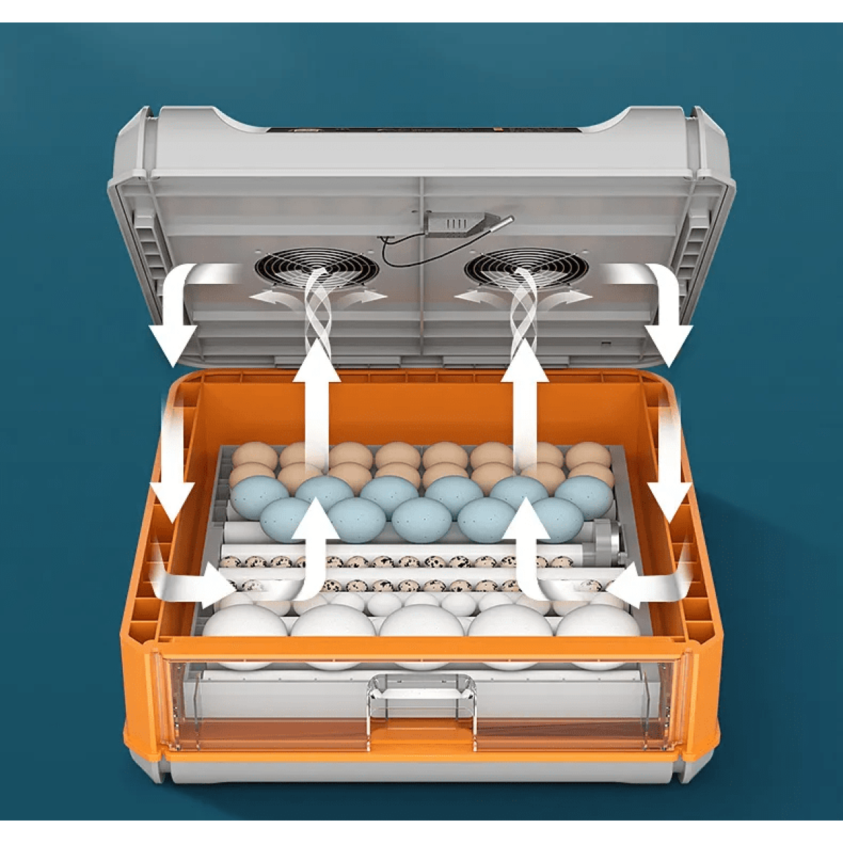 Для принудительной циркуляции воздуха и распределения тепла в крышку встроено 2 вентилятора. Инкубатор упаковывается в короб из плотного спрессованного пенопласта. Его можно использовать в процессе инкубации, дополнительно уменьшая теплопотери.