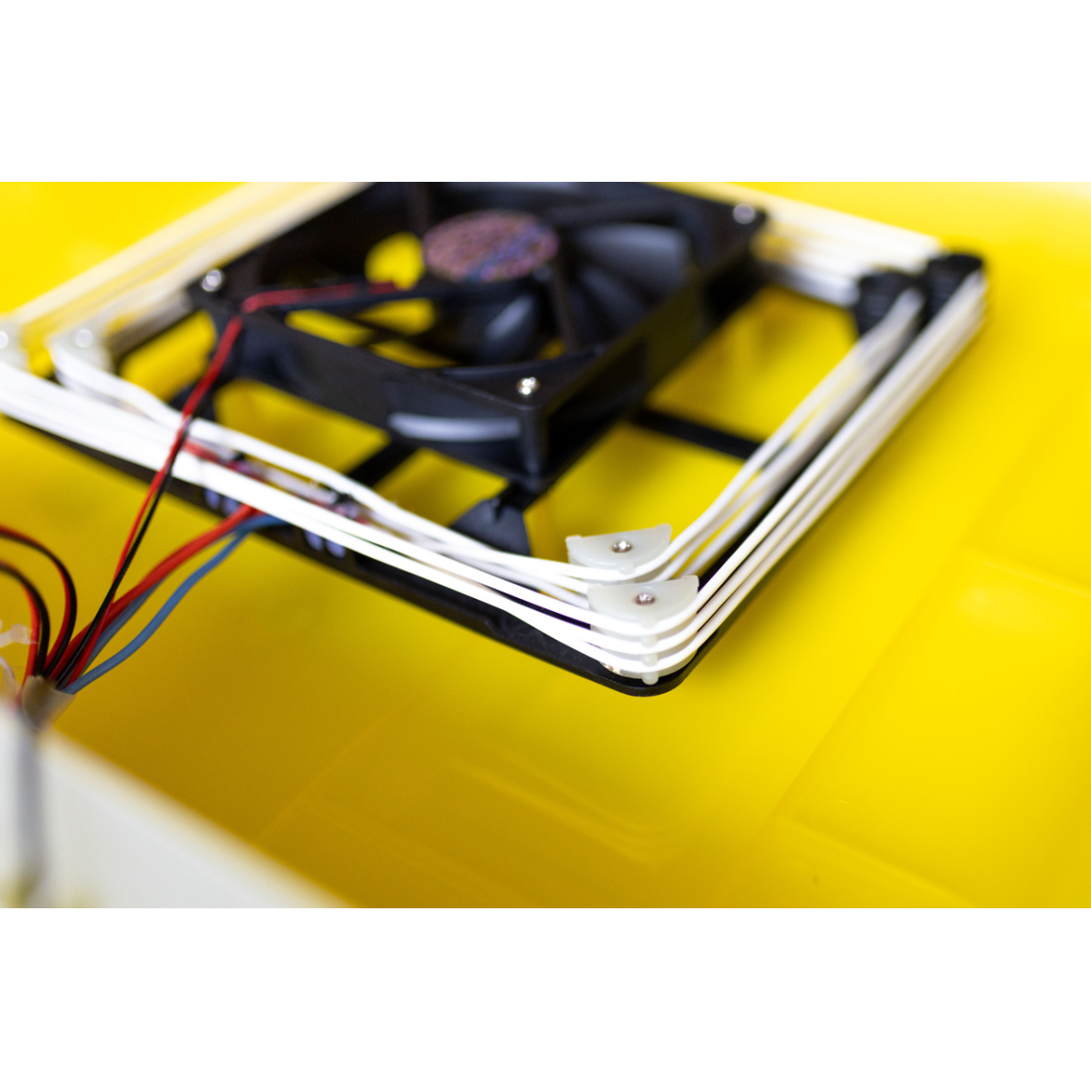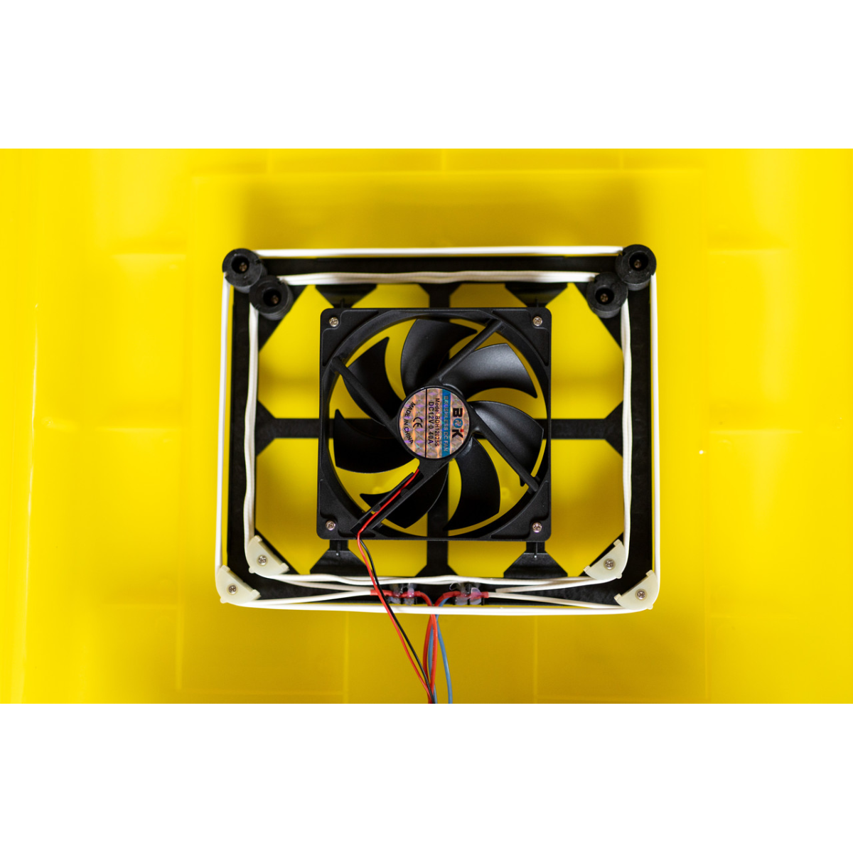 Для рівномірного нагріву в даній моделі встановлено 2 безшумних вентилятора. 1й з'єднаний з нагреваетльным елементом, 2й між двома ярусами закладки яєць.