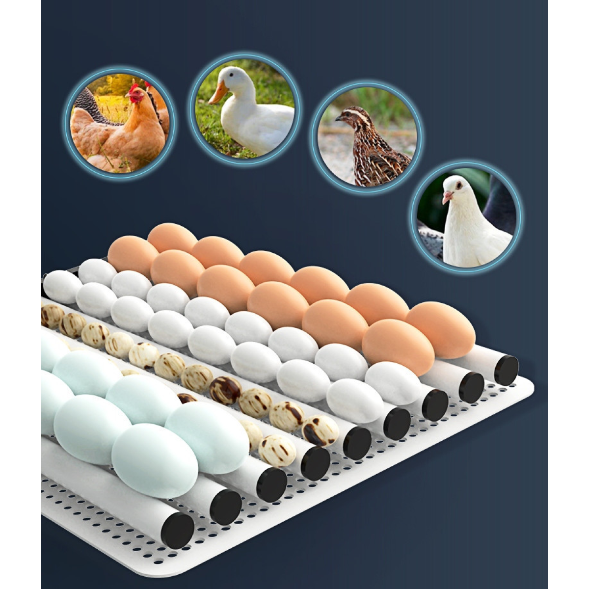 Состоит из роликов (9 штук), расстояние между которыми 1,7см. Таким образом, подойдет для инкубации ВСЕХ типов яиц, размер которых больше 1,7 см.