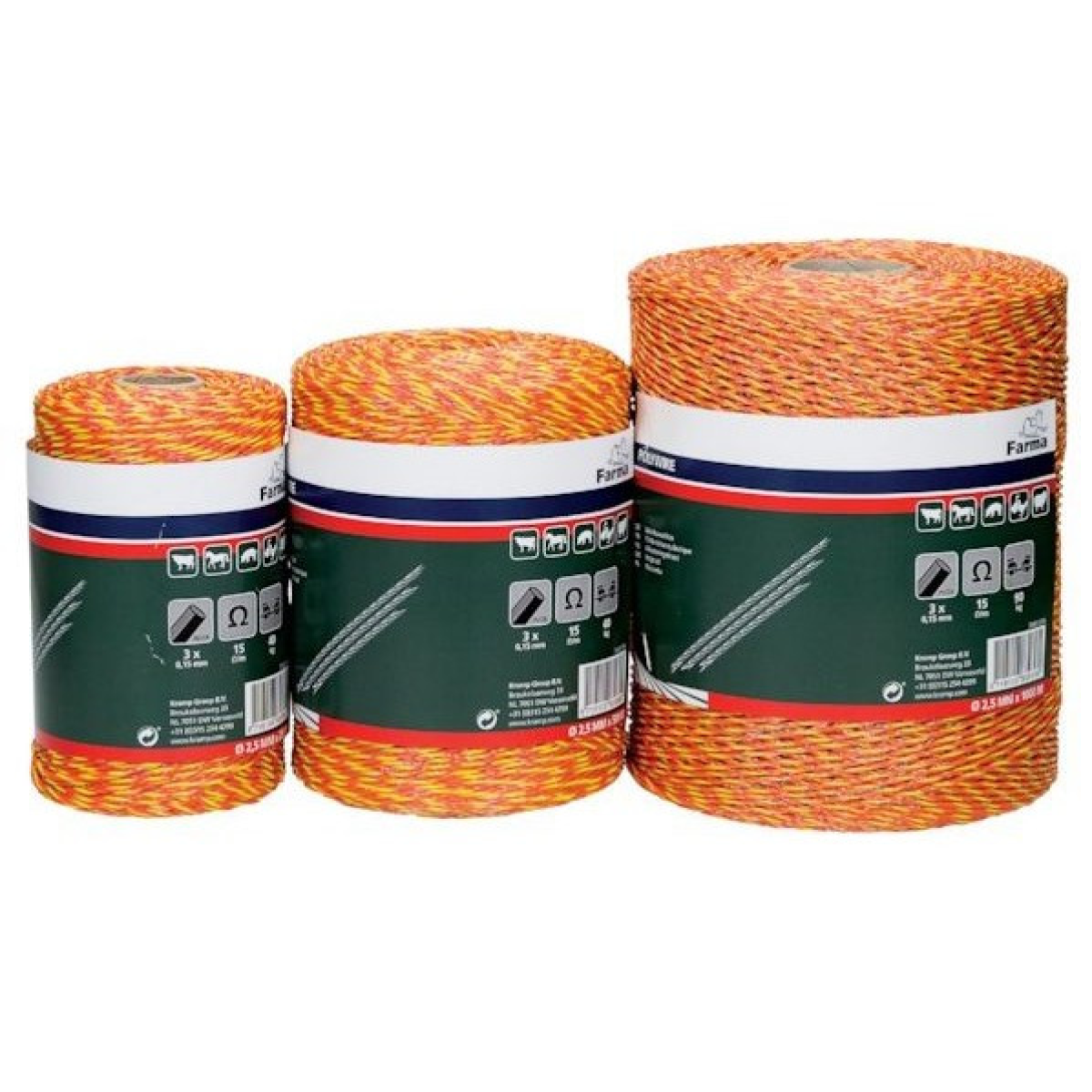 Шнур (бічнівка) Farma для електроприроди 3-жильний Поліетиленовий шпагат із вплетеними сталевими оцинкованими провідниками 3х0,15 мм. застосовується для переносних електричних огорож малої та середньої дальності. Опір: 15 Ом Міцність: 40 кг. Товщина шнура: 2,5 мм.