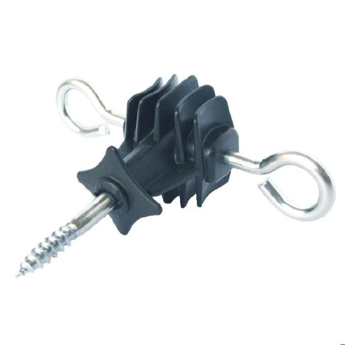 Ізолятор із двома зачіпками для воріт електровиробу Ізолятори призначені для монтажу комірної системи електророзгороду із застосуванням тросового або дротового провідника. Ізолюють провідник (дротоку, шнур, трос тощо) від контакту з опорою електропастуха. Штифт, вбудований у формовану деталь, і численні виступи забезпечують кращу ізоляцію. Угвинчується в дерево Для дроту та линви. Стійкий до погодних умов і УФ-випромінювання.