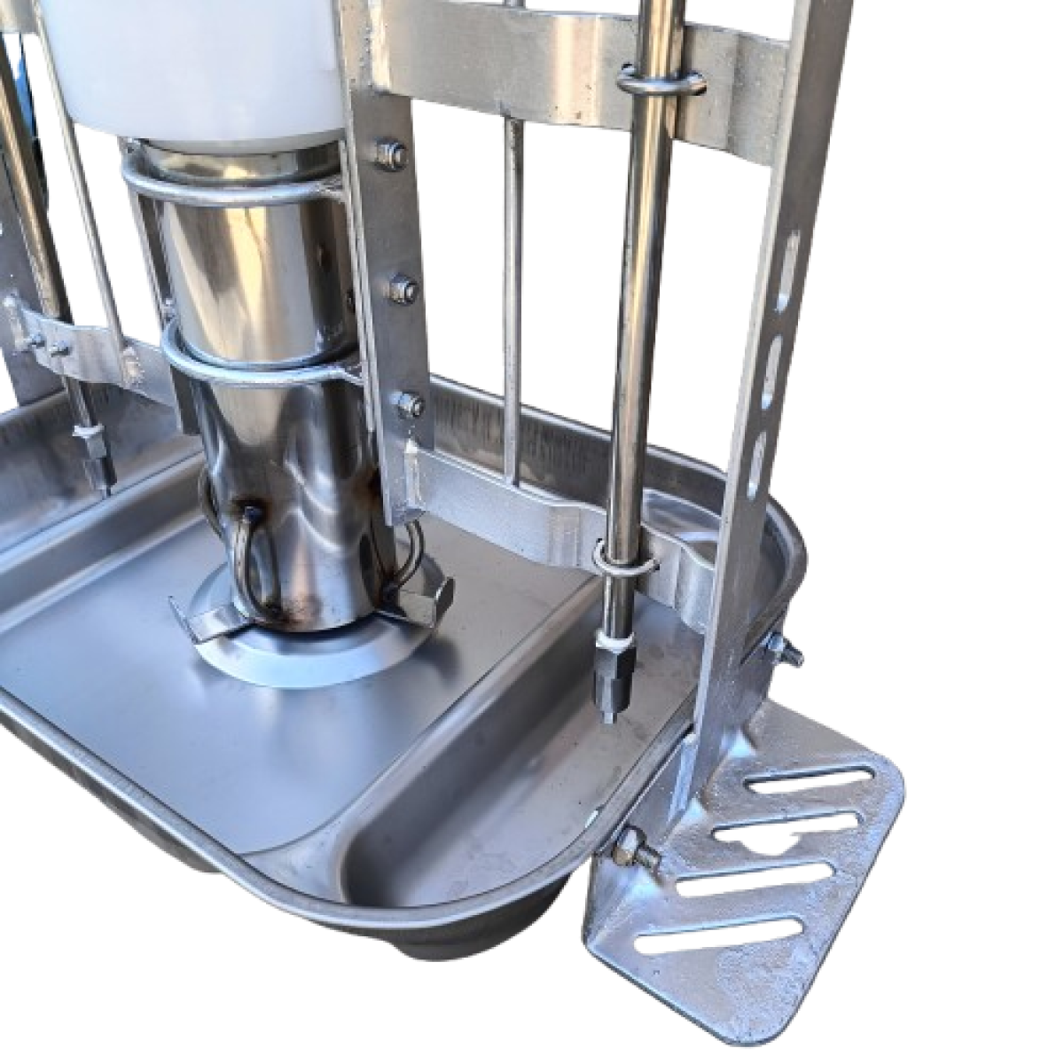 Тубомат FDR имеет две встроенные ниппельные поилки, вода из которых подается в специальные емкости, расположенные по бокам кормовой тарелки оснащенные отвертиями для предотвращения перелива воды в отсек для корма. Это решение позволяет экономить воду, и при этом сохранять корм сухим, что соответсвенно минимизирует риск образования в корме гнилостной микрофлоры и заболевания свиней.
